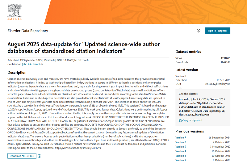 当データベースでは、引用数、h指数、共著指数、異なる著者の立場での論文引用数及び複合指標等に関する標準化された情報をもとに作成され、文献データベースScopusに基づき、22の科学分野と174のサブ分野において、5本以上の論文を執筆した全科学者を対象にサブ分野における順位等が掲載されています。