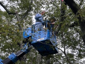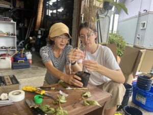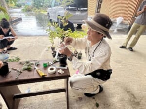 前日に採取した変異枝から葉芽を探し、小林樹木医と本多先生の指導を受けながら芽接ぎを行いました。作業には、フランスからの留学生であるジャンヌ・ブイエさんらも参加し、浪江町の桜を復興させるプログラムを見学・体験しました。