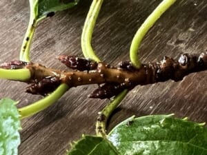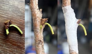 リバーラインのソメイヨシノ変異枝から葉芽のある枝を採取し、台木となるオオシマザクラの苗木に移植する方法です。